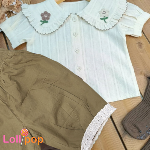 ست دخترانه وارداتی (شومیز نخی خامه‌دوزی و شورتک کتان)
