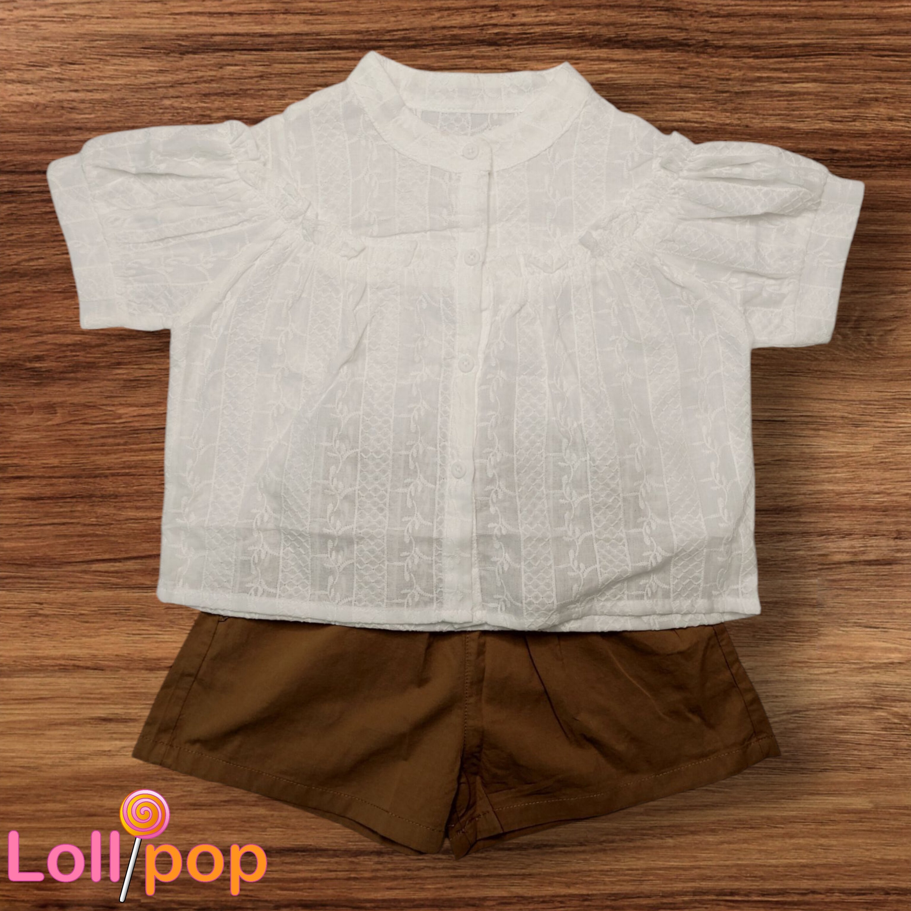 رنگبندی : شومیز سفید ، شلوارک قهوه ای